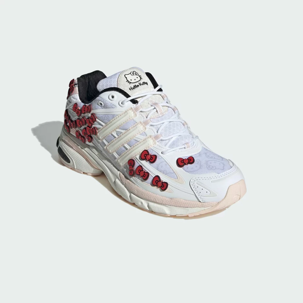 Las Adistar Cushion '50th Anniversary' de Hello Kitty x adidas para mujer celebran el medio siglo de la icónica mascota de Sanrio. Veinticinco de los característicos lazos rojos de Hello Kitty adornan la parte superior de cada zapatilla, con malla blanca transpirable, revestimientos sintéticos tonales y las tres rayas moldeadas. La marca Hello Kitty adorna la lengüeta y la plantilla. Estas zapatillas retro se asientan sobre una entresuela de espuma color hueso con amortiguación Adiprene en el talón.