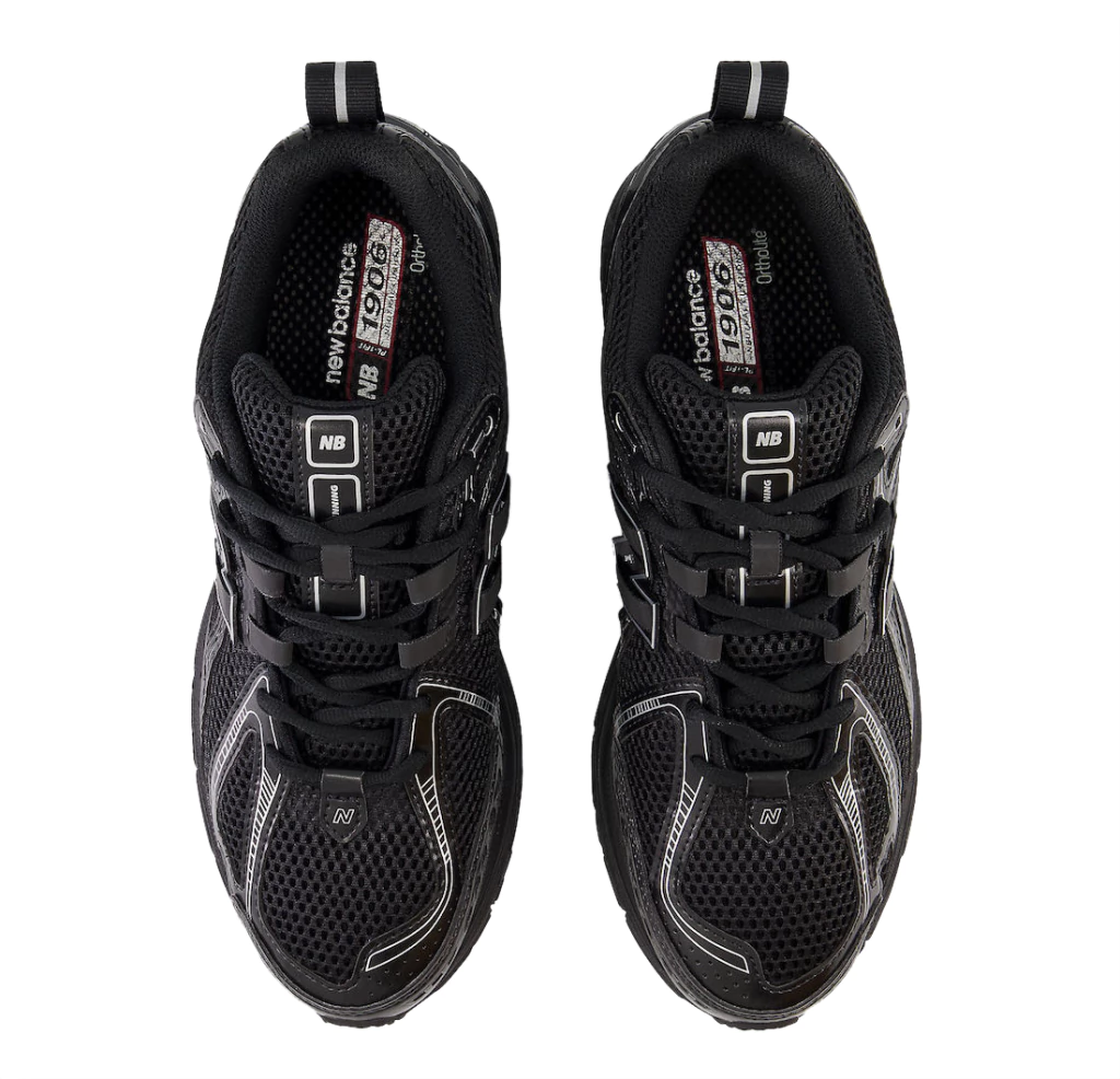 Las New Balance 1906A 'Black' presentan líneas angulares y una construcción en capas. La parte superior combina una malla negra transpirable con revestimientos sintéticos resistentes en negro y peltre a juego. El logotipo "N" está integrado en el sistema de cordones N-Lock para una sujeción firme en el mediopié, mientras que una estructura de TPU moldeada en el talón proporciona estabilidad en la parte trasera del pie.